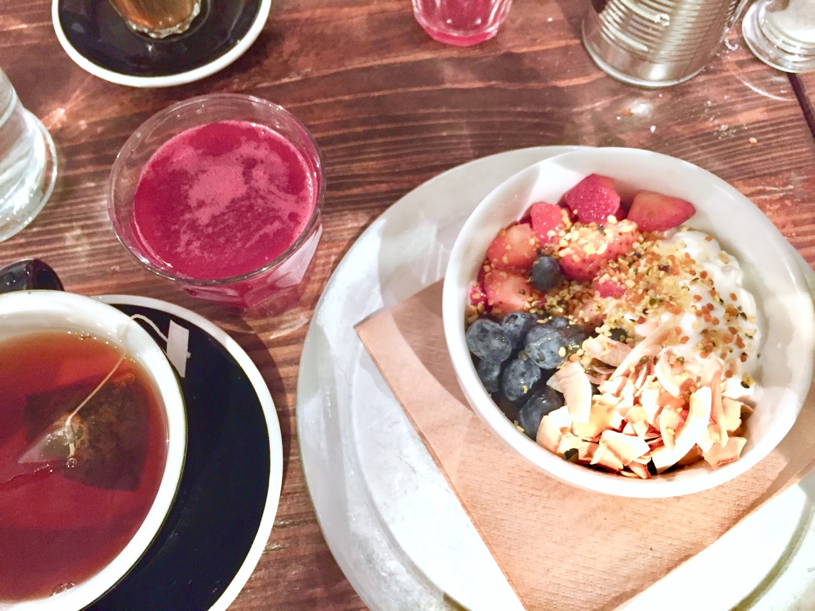 An unserem letzten Morgen waren wir dann noch bei The Good Life Eatery frühstücken. Hier wollte ich unbedingt hin, da ich auf Instagram viele positive Berichte gesehen hatte. Es gibt hier viele Bowls mit Superfoods und Co. Ich entschied mich für die Granola Bowl mit Kokusnussjoghurt und einen English Breakfast Tea und einen frisch gepressten Saft. Die Säfte sind der absolute Oberhammer! leider ist es auch der Preis (250 ml kostet ca. 7 Pfund) trotzdem war der Saft (ich hatte magic 7 oder so ähnlich) den Preis wert. Die Portion des Granolas war mehr als ausreichend und der Tee wie immer gut. Leitungswasser gibt es hier und übrigens auch in fast allen Restaurants in London kostenlos. Das Granola kann sowohl mit griechischem Joghurt oder milchfrei mit Kokosjoghurt bestellt werden. Damit die Bowl vegan ist müsst ihr zusätzlich die Blütenpollen (Deko) abbestellen. Bezahlt haben wir hier für zwei Personen ca. 25 Pfund. The Good Life Eatery: 69 Marylebone Ln, Marylebone, London W1U 2PH – station oxford circus, bond street (mehrere Filialen)